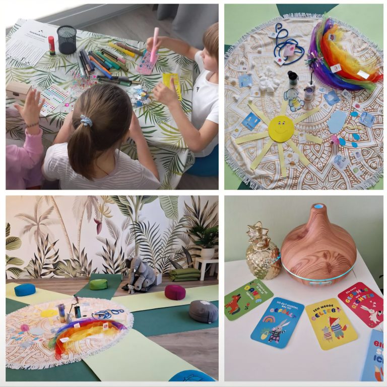 Wir üben in Stille, bewegt, mit Musik und Farben. Wir lernen kleine Rituale, Stark-Mach-Tricks, Yogaübungen, oder Massagen kennen. Diese könnt ihr auch gut in euren Alltag einbauen.